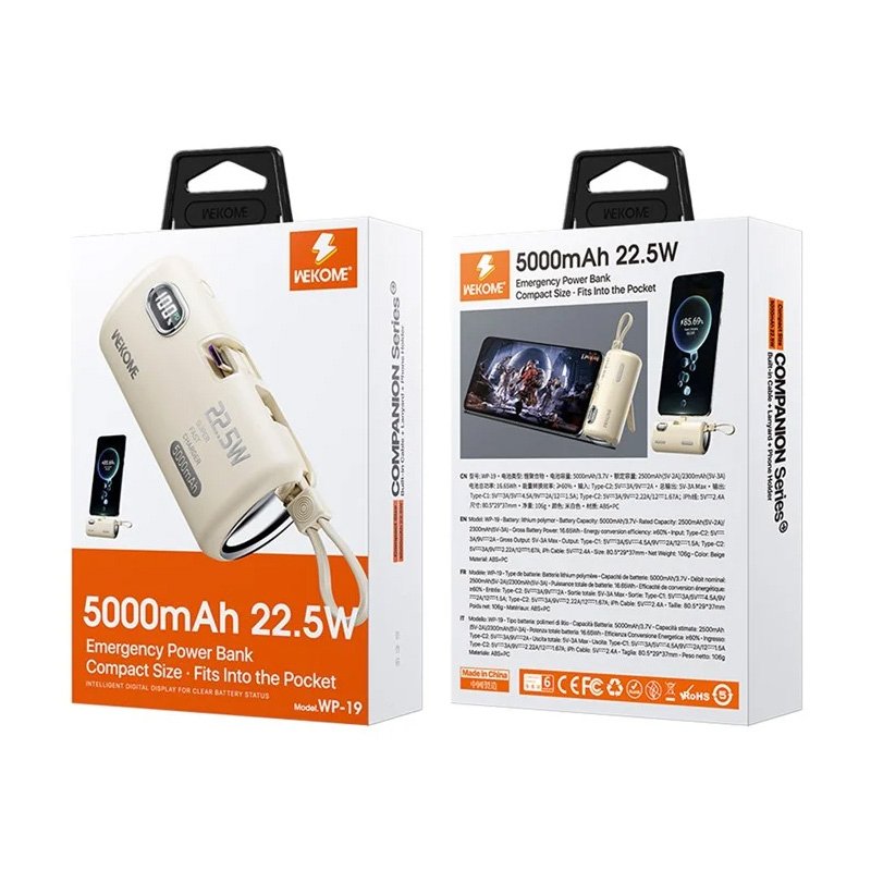 WEKOME WP-19 5000mAh Portable 22.5W Fast Charger Power Bank White CE/ROHS Certified1. Experience lightning fast charging with our 22.5W super fast charging power bank, with high power, yourdevices will be powered up in no time2. Efficiency meets versatility with three fast outputs and a single fast input, stay charged on the go withmultiple devices, while enjoying fast recharging for your power bank3. Stay informed with our smart digital display, providing clear battery status at a glance, never be caughtoff guard by a drained power bank again4. Designed for ultimate convenience, our power bank features a multifunctional and portable design,complete with a cable, lanyard and phone holder, it’s your all-in-one charging solution5. Compact yet powerful, our power bank packs 5000mAh for emergency charging wherever you go, itspocket-friendly size ensures you’re always prepared for a battery boost